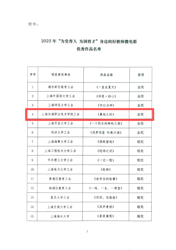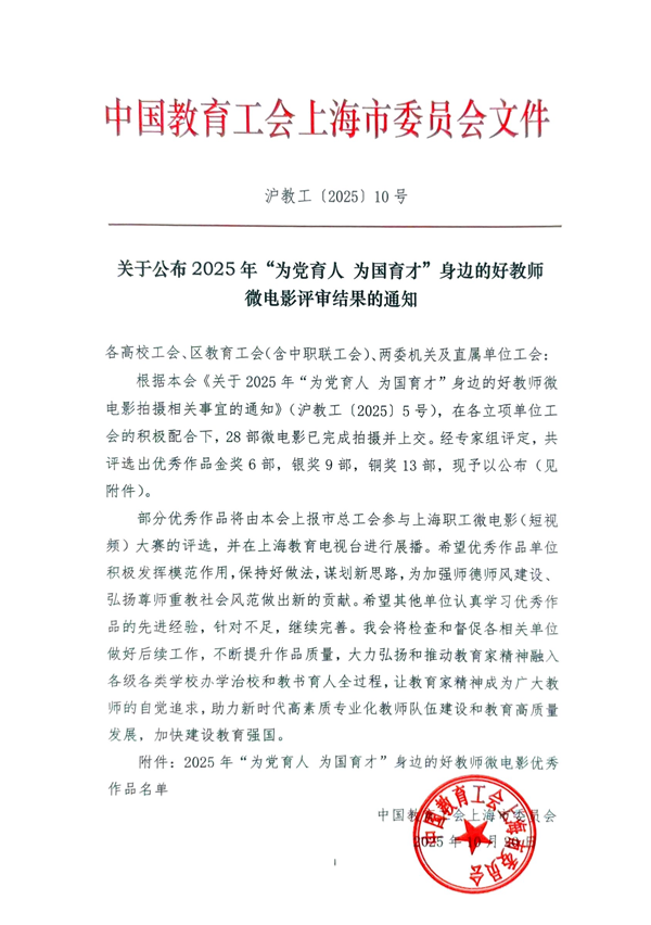 近日,上海市教育工会公布了2025年“为党育人为国育才”身边的好教师微电影评审结果,我校报送的以经管学院集体为原型的微电影作品《幕起之时》,在28个单位的作品中脱颖而出,荣获“金奖”,并将在上海教育电视台进行展播。